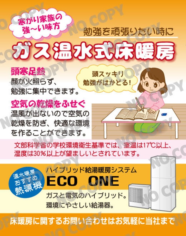 ーーーーーーーーーーーーーーーーーーーーーーーーーーー 頭寒足熱で集中力アップ!家族の勉強も応援する床暖房 ーーーーーーーーーーーーーーーーーーーーーーーーーーー 子どもの勉強がはかどらない、家の中が寒くて集中できない…そんなご家庭におすすめなのが「ガス温水式床暖房」です。顔まわりが熱くならず、足元からじんわり温まるので、頭がスッキリして勉強にも最適な環境が整います。寒さを我慢させることなく、快適な空間を保てるため、保護者の安心にもつながります。 ・頭寒足熱で勉強に集中できる温かさ ・温風が出ず空気を汚さず乾燥もしにくい ・室温17℃・湿度30%以上を保ちやすく、学校基準の環境に近づける ・「ECO ONE」でガスと電気を効率的に使った省エネ給湯暖房が可能 このコンテンツを配信することで、「勉強に集中できる環境づくり」という切り口から床暖房の魅力を訴求でき、教育に関心の高い子育て世代との接点強化につながります。また、ガスの使用量増加による売上アップも見込める施策です。 「家族思いのあたたかさ」を今すぐ配信して、地域のお客様の心をつかみましょう!