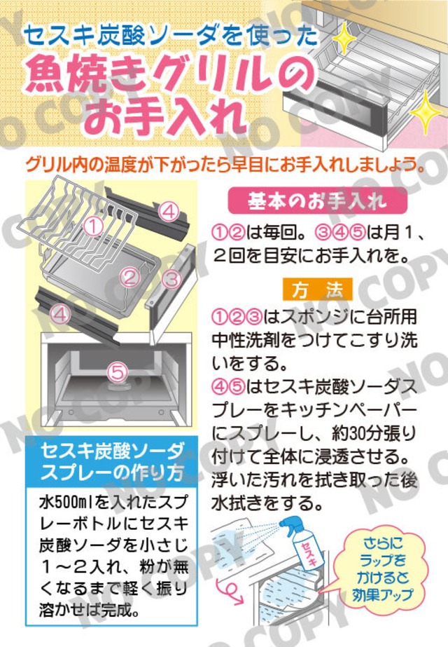 魚焼きグリルの掃除がラクになる!セスキ炭酸ソーダ活用術 魚焼きグリルは美味しい料理の強い味方ですが、汚れが溜まると加熱効率が下がり、ガス使用量も増えてしまいます。そんな悩みを解決するのが、セスキ炭酸ソーダを使った簡単グリル掃除。LPガス事業者がこの情報を配信することで、「ガスの賢い使い方」と「手間の軽減」というWの価値を顧客に提供できます。 ● グリルの網や受け皿は中性洗剤でこすり洗い ● 庫内の汚れにはセスキ炭酸ソーダスプレーを使用 ● キッチンペーパーで30分湿布し、拭き取るだけ ● スプレーは自作可能。経済的で安心 このコンテンツを通じて、顧客はガス機器をより清潔に、効率的に使えるようになります。グリルの性能維持がガス使用の最適化につながり、顧客満足度や接点強化にも直結。掃除の負担軽減という生活提案型アプローチは、他社との差別化にも有効です。 今すぐこのお手入れ情報を配信して、ガスの価値をもっと伝えましょう!