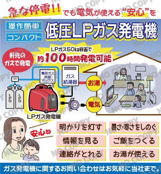 突然の停電でも、暮らしを止めない備えは万全ですか?低圧LPガス発電機なら、ガスボンベが電源となり、電気とお湯を家庭に供給。LPガス事業者がこのコンテンツを配信することで、災害時の安心を訴求しながら、自社のガス利用促進にもつなげることができます。