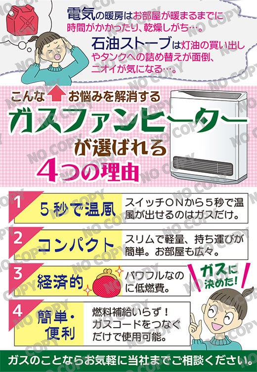 電気暖房では部屋が暖まるまでに時間がかかり、石油ストーブは灯油の買い出しやニオイがネック…。そんな冬の悩みを一気に解決するのが「ガスファンヒーター」です。LPガス事業者がこの製品をLINEで紹介することで、冬季のガス需要を高めながら、お客様に快適な暮らしを提案できます。