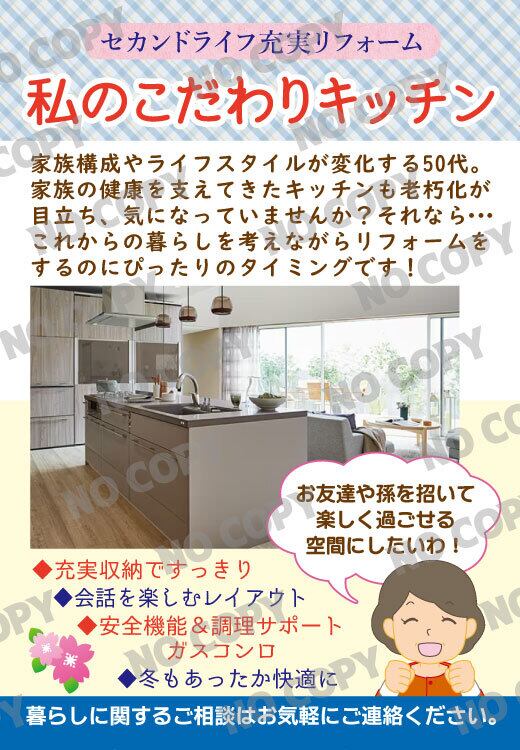 ライフスタイルや家族構成が変わり始める50代。長年家族を支えてきたキッチンの老朽化が気になってきた…そんな声に応えるのが、この「こだわりキッチンリフォーム」です。会話が弾むレイアウトや、安全性に配慮した機能など、これからの生活を見据えて空間を見直す絶好の機会。配信することで、「暮らしを楽しむリフォーム」という切り口でお客さまとの接点をつくり、ガス機器の提案にもつなげられます。