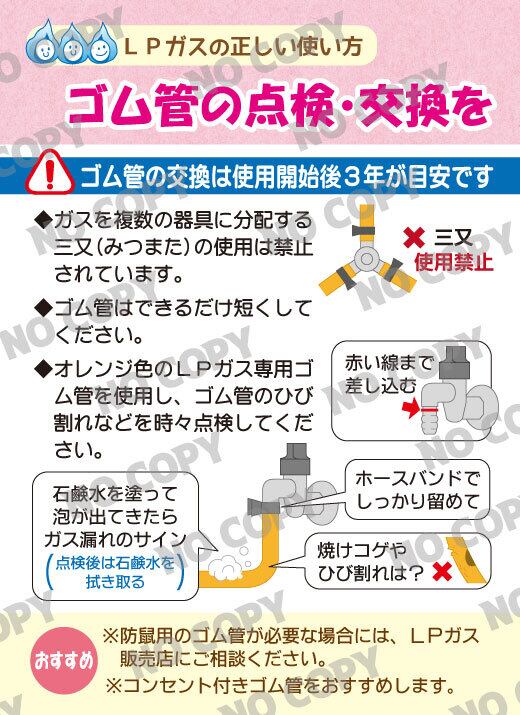 LPガス機器の安全な使用には、ゴム管の定期的な点検と正しい取り扱いが欠かせません。劣化したゴム管はガス漏れや火災などの事故につながる恐れがあり、見落とされやすい部分だからこそ、事業者からの注意喚起が重要です。このコンテンツは、ゴム管交換の目安や注意点をビジュアルで分かりやすく伝えられ、安全意識の向上と信頼獲得に貢献します。
