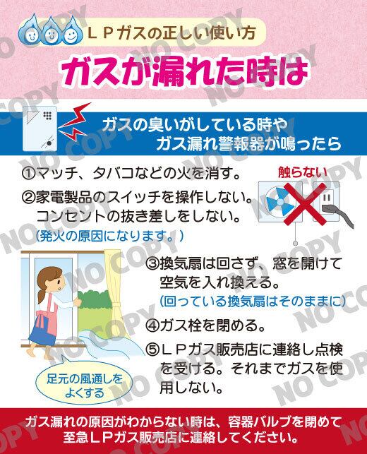 こうした正しい対処法を事前に知っておくことで、お客様の安全確保だけでなく、LPガスの安心利用をサポートする事業者としての信頼度もアップします。また「困ったときは販売店に連絡を」と明記されていることで、連絡窓口としての接点も自然に強化され、定期点検や保安サービスの利用促進にもつながります。