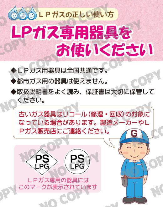 ・都市ガス用の器具は使用不可、誤接続に注意が必要